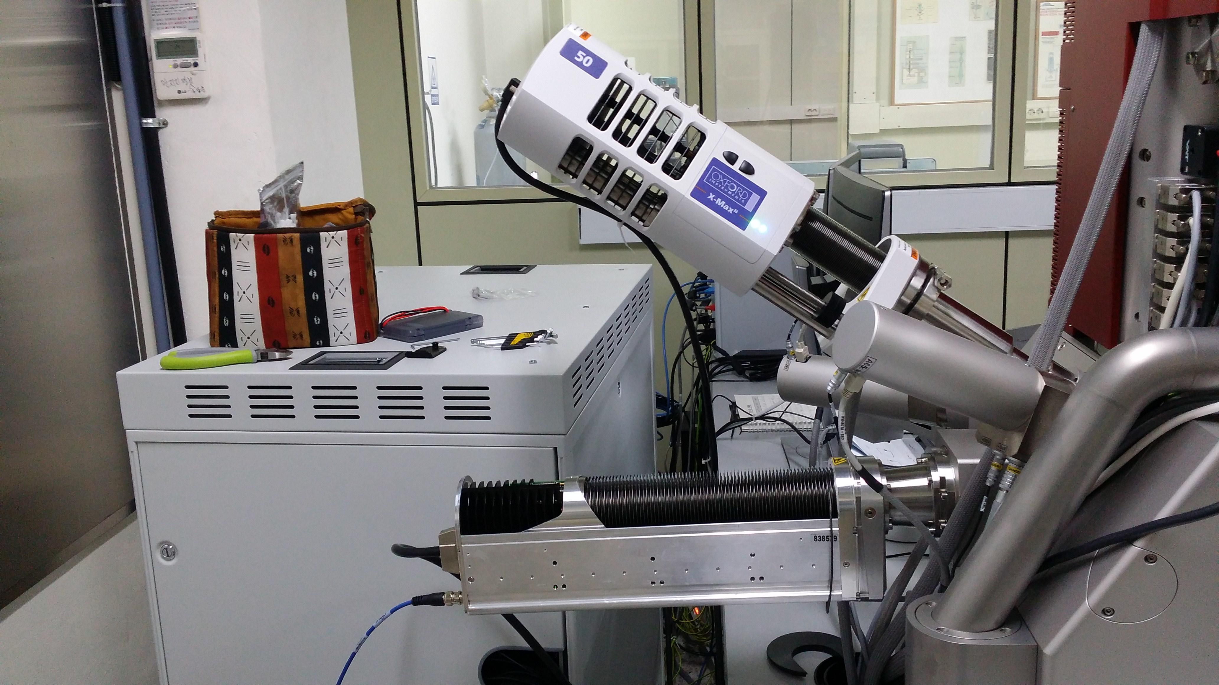 전자현미경의 시료실에 검출기를 부착하여 사용되는 미소영역분광분석장치로서 전자현미경의 전자총에서 전자빔이 시료의 표면을 주사할 때, 전자와 시편의 상호작용에 의해 방출되는 특성 에너지들을 반도체 소자로 이루어진 검출기를 이용하여 에너지 준위별로 분광시킴으로써 관측되는 미소영역에 대한 정성/정량분석을 할 수 있으며, 시료의 조성에 따른 점 분석, 선 분석, 면 분석 등도 할 수 있다. 2. Electron Back Scattered Diffraction 전자현미경에 부착되어 사용하는 전자후방산란회절 기기이며, 전자현미경의 전자총에서 전자빔이 분석 시료의 표면을 주사할 때 전자와 시편의 상호작용에 의해 방출되는 후방산란회절전자를 검출하는 장치로서 이를 통해 미소영역 분석이 가능하다. 이외에 시료의 점분석, 선분석, 면분석 등을 할 수 있으며 최종적으로 시료 내부 물질의 구조 분석을 하여 다양한 재료의 특성 등을 연구하는 데 쓰인다. |